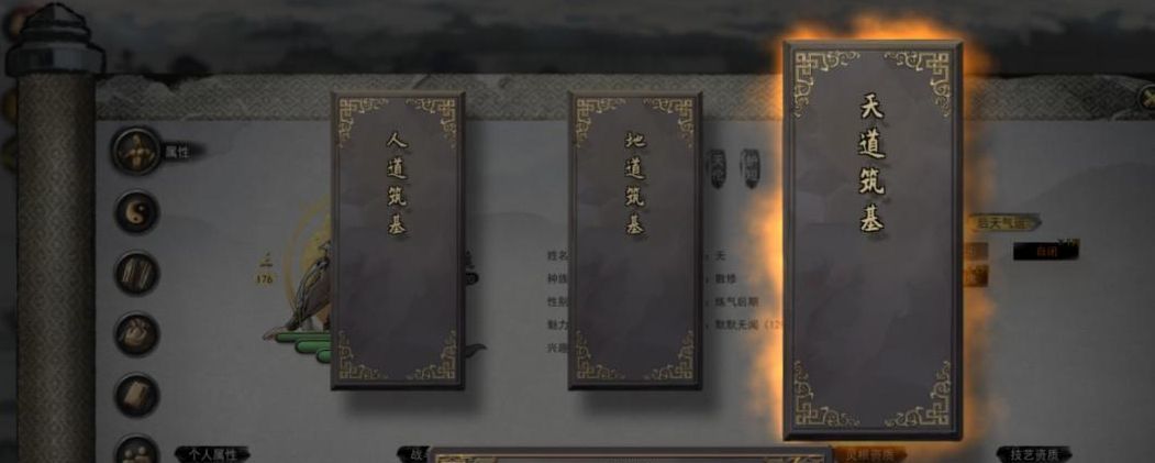 另外在突破时,天道筑基,需要有三件通灵秘境的BOSS掉落的天材地宝和6种不同属性的灵气各一个,可服用天乾丹增加成功率,成功后有六个属性选项;地道筑基,则需要2种天材地宝加上三种属性的灵气,可服用地坤丹增加成功率,但成功后有三个属性选项;而人道筑基,只需要六品筑基丹(或六品以上品质筑基丹)加上一种天材地宝即可,服用筑基丹可提升成功率,但成功后只有一个属性选项。