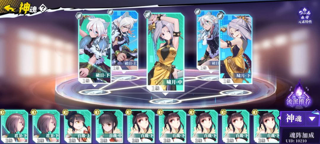 首充的三啸月虽然是万金油神魂,但也就个狗粮而已……主要是用来喂阶数的,所以也不能升级。再加上所有角色技能都有不低的攻击加成,所以推荐开局主攻系的搭配。
