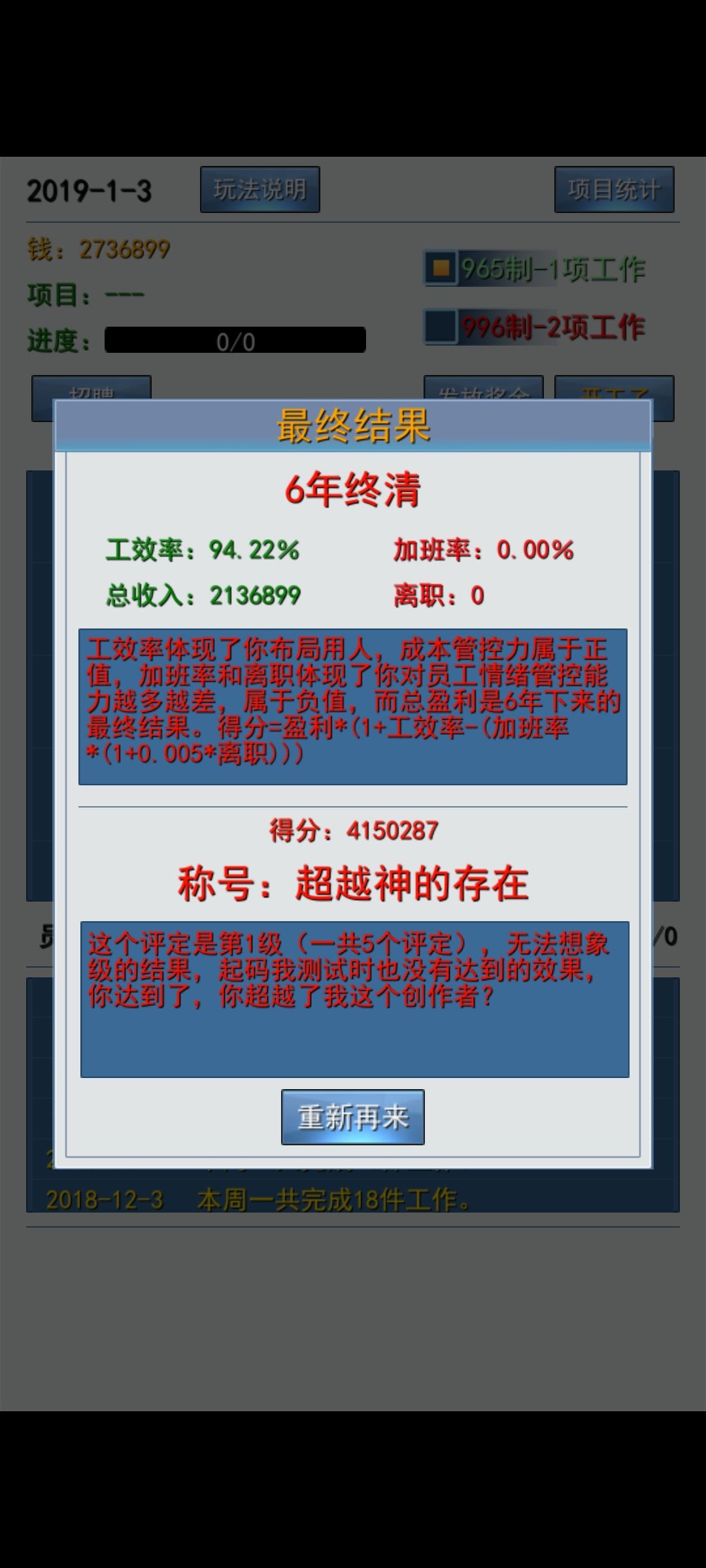 这个游戏窍门很简单,就是开始的时候尽量买能力低的员工,随着项目的提升剔除干不动的人,一点点换能力更高,不要用力过猛。无加班需要找忍耐50的养生便宜人。