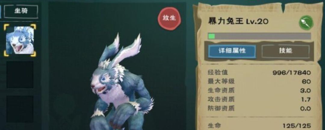 在创造与魔法游戏里,暴力兔资质是3.2-1.8-0。属性是宠物但需要达到50级才可以捕捉,捕捉之后饲料可喂食萝卜饲料包+竹笋饲料包+罕见肉(25包),并且会掉落罕见肉。