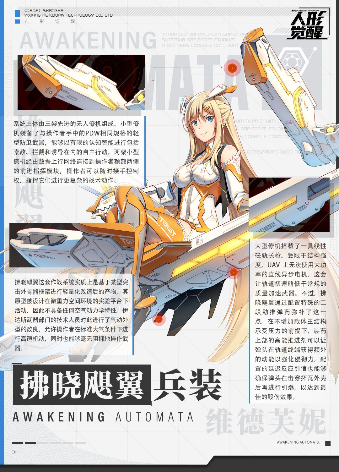 拂晓飓翼的系统主体由三架先进的无人僚机组成,小型僚机装备了与操作者手中的PDW相同规格的轻型防卫武器,能够以有限的认知智能进行包括索敌、拦截和诱导在内的自主行动;大型僚机搭载了一具线性磁轨长枪,并配置特殊的二段助推弹药及延迟反应引信,确保弹头在击穿拓瓦外壳后再进行引爆,以达到最佳的毁伤效果。