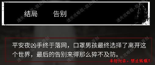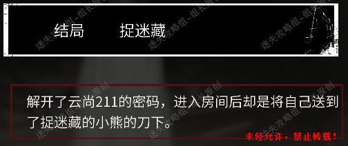 这里一定要注意,如果直接选择请笔仙,就算最后选了解释,面罩男也不会回复我们,一定要先选择其它两个中的一个,选进去后再选择试试后选另一个请笔仙以外的选项,进去后还是不回复,再在最后选择试试,请笔仙,之后选择解释,就能触发剧情,面罩男劝我们不要深入了解。之后选择结束,达成结局。
