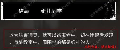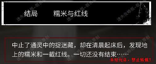 通用结局,没有太多说明的必要,进了二院走过迷宫不去荒村直接报警就行。考核四那边直接讨论线索说明去过迷宫也行。
