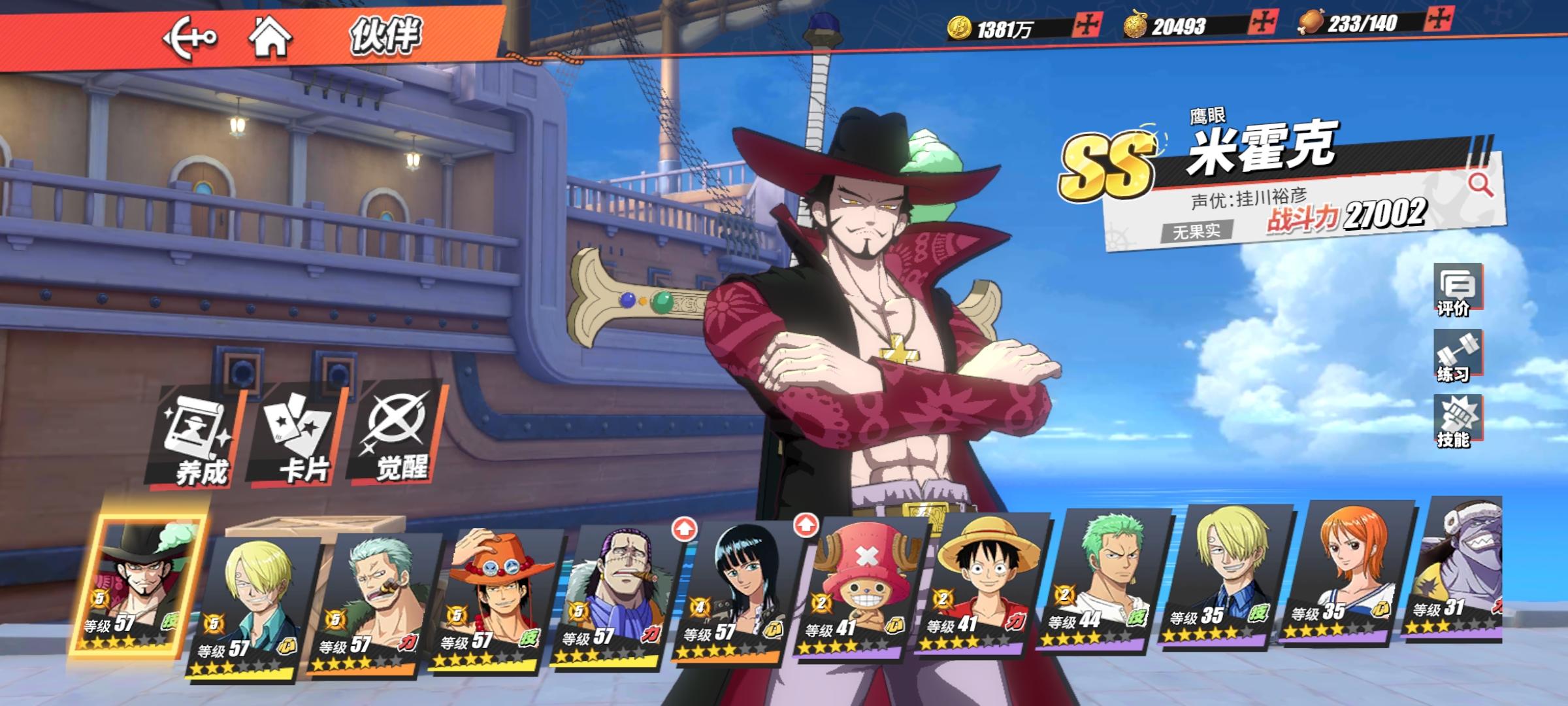 日常就培养艾斯,索隆。烟鬼,路飞。罗宾乔巴。A卡碎片获得的也多,卡片就靠日常那些慢慢攒。