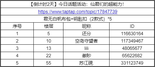 恭喜以上五位仙君,请在5月13日前联系官方微博@此生无白手游,私信发送【TapTap ID号截图】、【姓名】、【邮寄联系电话】、【收件地址】,信息收集完毕后,小仙官会尽快为大家发出礼物!