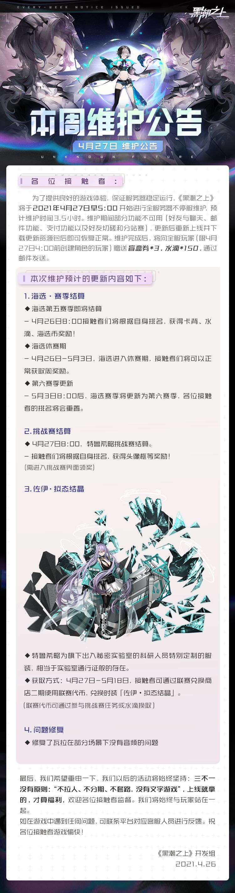为了提供良好的游戏体验,保证服务器稳定运行,《黑潮之上》将于2021年4月27日早5:00开始进行全服务器不停服维护,预计维护时间3.5小时。维护期间部分功能不可用(好友与聊天、邮件功能、支付功能以及好友切磋和分站赛),更新后重新上线并下载更新资源包后即可恢复正常。维护完成后,将向全服玩家(限4月27日4:00前创建角色的玩家)赠送盲盒券*3,水滴*150,通过邮件发送。具体详情,请接触者戳下方长图查阅。