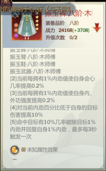 正阳两件套是会心15%,振玉两件套是会心20%,但振玉有个弊端,就是费内角色就不合使用,适得其反。还好我们木师傅操作输出手法比较多,其中有一个手法是不耗内。就很适合。