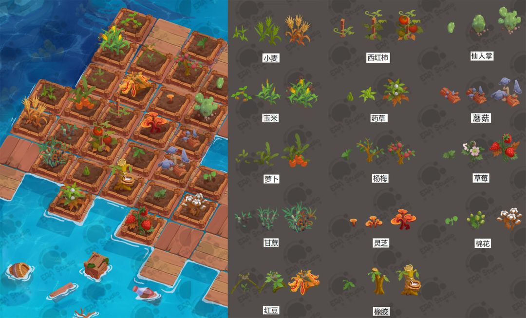 【游戏美术】一款游戏的美术风格可以说是最初吸引玩家的因素之一。我们在美术风格、UI、角色人设上都进行了很多次讨论、修改,最终在美术大大们一遍又一遍的修改中呈现出了现在独特的的卡通风格。平静的蔚蓝海面上,阵阵微波荡漾,水下隐隐约约可以看到水母、小鱼、珊瑚,但也有一些塑料、垃圾在水上漂浮……给玩家一种真实的海上体验。但是海面下可不像海上这么风平浪静,多种形象的鲨鱼会随机在玩家的木筏边出没,要小心鲨鱼的攻击哦。我们还设计了多种农作物和建筑,但由于我们独特的求生主题,因此农作物和建筑的设计又不能太过明艳可爱,需要朝求生的方向靠拢,于是有了我们现在独特的美术风格,希望大家喜欢~