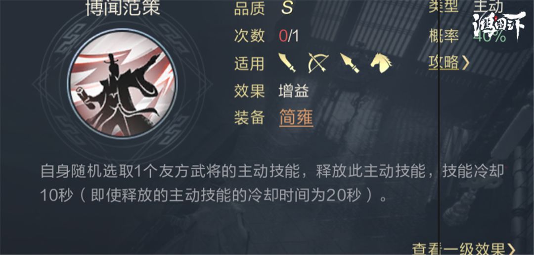 因法师队最怕控制、爆发高以及连击队,所以技能方面选择金蝉脱壳。20秒CD效果净化友方2名武将,并施加一个抵挡效果,弥补了队伍怕控的问题。第二个技能选择是博闻范策。随机释放友方的1个主动技能,无论CD是20秒还是10秒,都是释放一次。