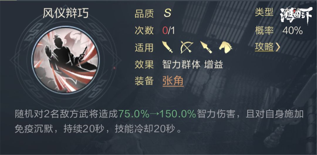 为什么不用通智,或者10秒CD技能而选择两个20秒CD技能呢?因为我们选择的辅助是简雍,简雍的技能是每10秒触发2次90%的概率无视CD,直接释放,刚好解决长CD导致的输出欠缺问题。这样张角就可以稳定的释放技能施加雷暴打输出~是不是非常快乐~