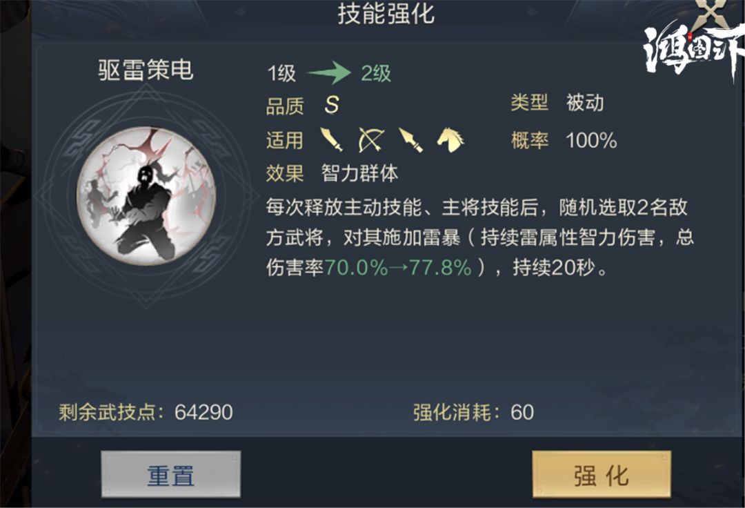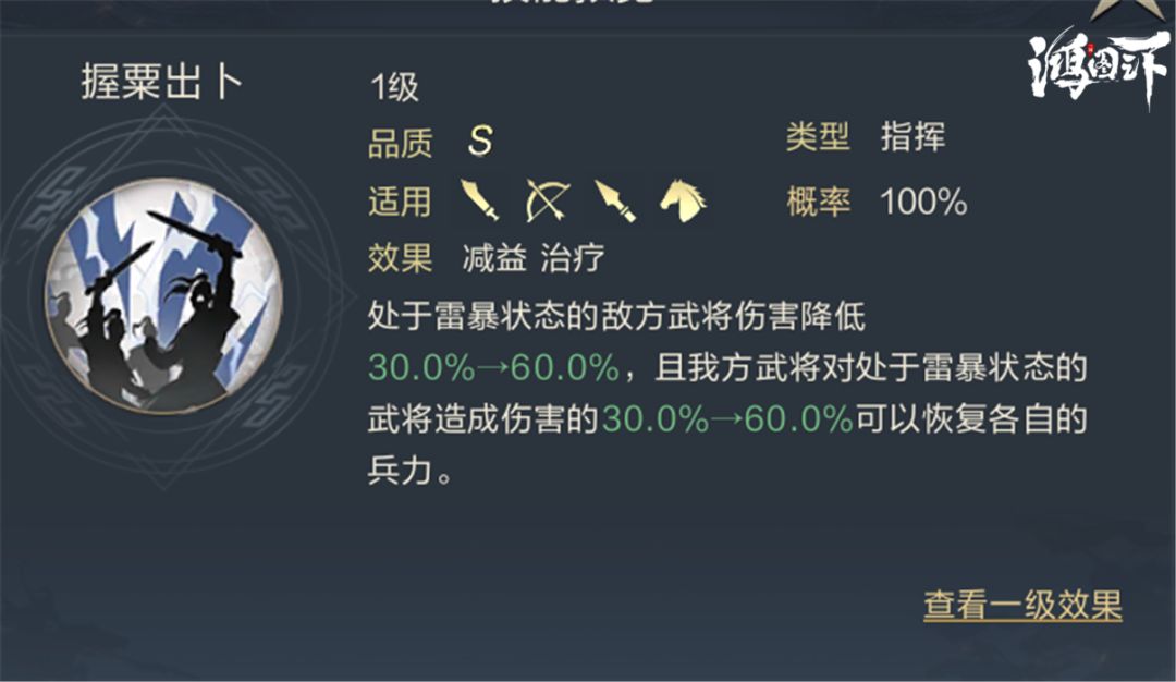 1、敌方武将处于雷暴情况下,在没有净化的情况下,敌方对我方造成的伤害降低60%;