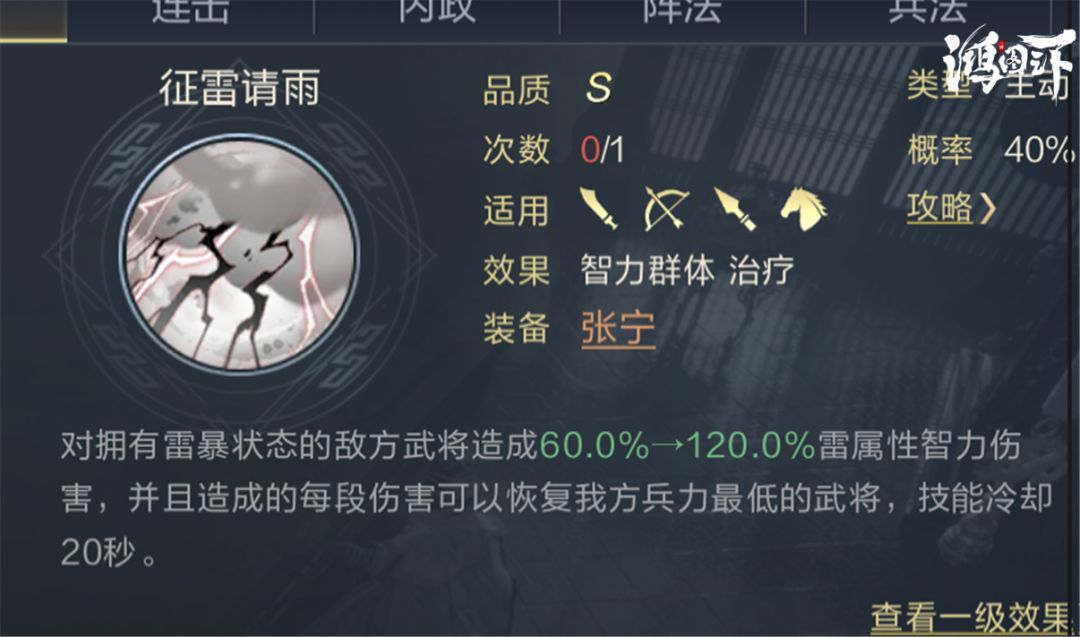 众所周知,前排的要求很严格,其一能抗,比如曹仁、周泰、孟获等。其二续航能力,很多人都在用华佗,但是张宁体系不需要华佗。张宁体系的核心还是高爆发输出,通过触发指挥技能回复60%兵力。但也不是不可以用华佗哈~玩了3个赛季了,大家也都知道,平地惊雷有施加雷暴的条件,有眩晕控制效果,且控制目标为2个目标。如今再带个续航技能,效果非常惊人。