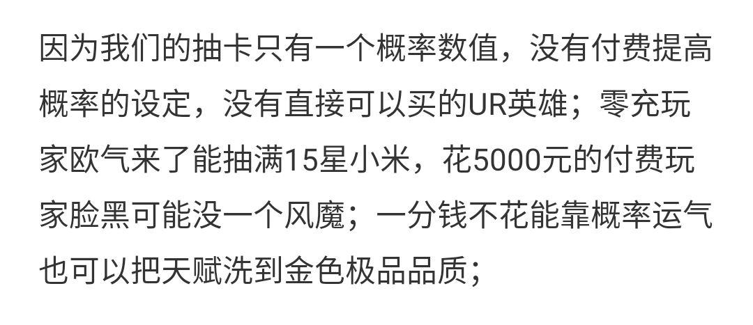 天赋也一样,氪佬买满了两天的礼包都没洗出好的天赋,零充和微氪就能洗出好东西了?零充攒同样的资源要多少时间,花多少精力?连充钱都解决不了的问题,对于零充和微氪之能更解决不了。这不是什么只针对氪佬的问题,这是所有玩家都要面对的。连氪金都提升不了的时候,说明这游戏设计的概率就完全不合理,零充提升只会更难,请游戏策划思考一下自身的问题,而不是摆出一副我们要做良心游戏的嘴脸然后把所有的锅甩给概率。