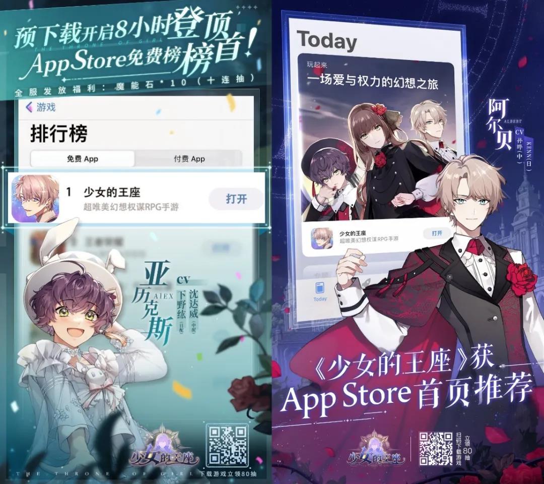 4月22日,由星辉游戏研发及发行的乙女向手游《少女的王座》正式开启公测。游戏上线前全平台预约达到300多万,21日开启预下载后便登顶iOS免费榜,24小时下载量突破100万。