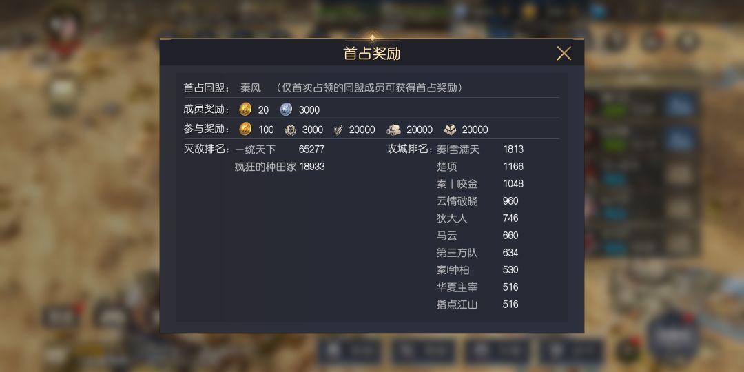 建议将参加攻城前60名的人员姓名都体现在上面(因为产业最高就60个),在这些名字后面体现分配产业选项,里面再分高级产业和普通产业,为什么我要提这个问题,因为你们不在游戏中,可能体会不到盟主等管理人员的压力,又要带动游戏氛围、安排PK、攻城、又要对参与游戏活动活跃的玩家分配奖励,而且还要做到公平。要不 光有前面这几个人,后面参与的人不显示出来,盟里的管理人员还得盟里再百来个人里面一个一个挑出来再分配特费事,完全没有必要,所以尽量弄方便一点。好多人都是上班族,本来有的时间就不是很多,在这上面浪费时间没有必要啊。