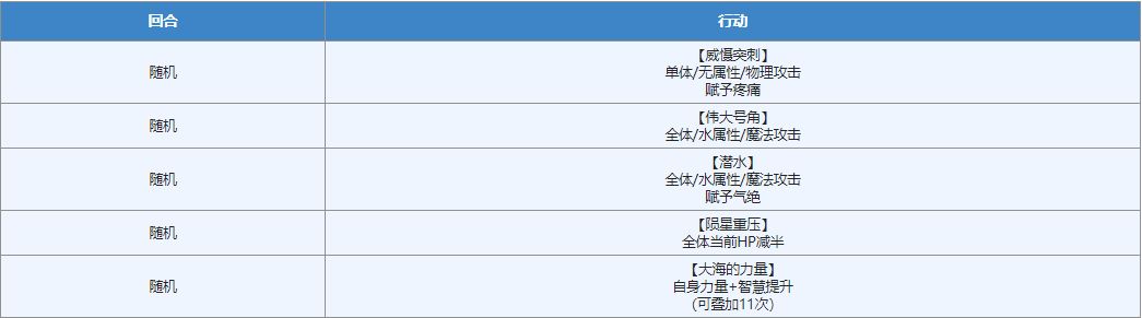 2、BOSS技能“大海的力量”可叠加11层,可以考虑在保证换阵生存的前提下用四星角色“埃莉娜”上阵进行清除。但是如果能保证上述五种状态无缝覆盖的话,我方勉强也能耐受以上强度。