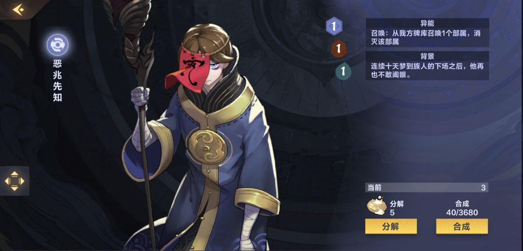 【恶兆先知】是这套卡组的必备组件,没有堆墓哪里来的复活,起手没有先知会很难打,但是要注意!!起手有先知也不是1费一定要打,下先知前一定要考虑清楚拉出各种部署的情况是否对自己有利,之前我经常1费下先知出萧红月,然后给对面减费当了内奸,5费时就被对面斩了〒▽〒,还要考虑是不是下一回合再下先知收益更大,比如遇到复活木,可以先打【黑莲圣火】,再下先知期待能拉出女神回收墓地的【黑莲圣火】,总之不要1费无脑下先知