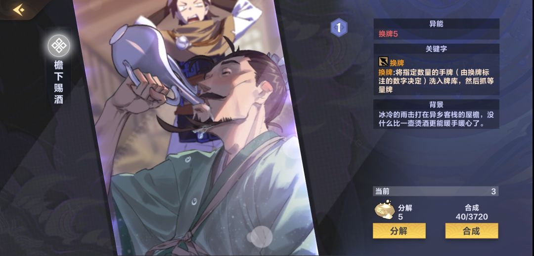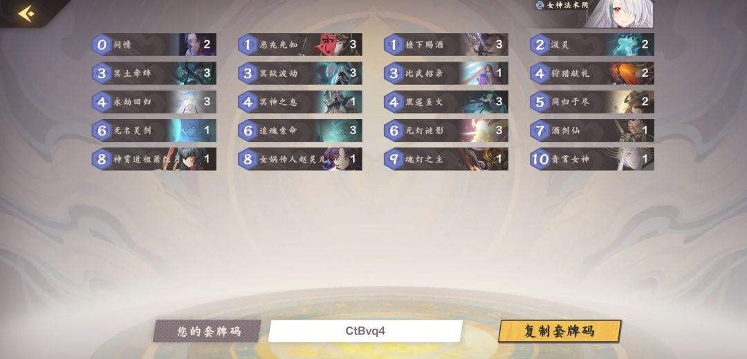 【檐下喝酒】前期换牌找先知或者换走手上的高费部署,后期换牌找【同归于尽】和【魂灯之主】,虽然净亏一卡,但是没牌了可以大招复活女神补卡,也可以复活女神后再打,把墓地回手的不要的牌换成牌库里想要的牌,起手没有先知可以留一张,和先知一样不一定要1费就打,本身换牌5起手就打只能换四张就不能最高效的找先知,可以先打低掉费解场法术再换走手上的高费牌,如果觉得对局中不是经常卡手可以带2,我这种经常卡手的还是带3吧(ps非酋带十张都没用,有一把手上的萧红月被对面加成12费,想换进牌库再用先知拉出来,换了三次愣是没换走)