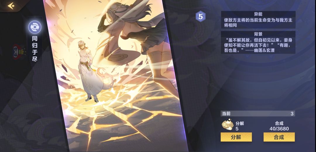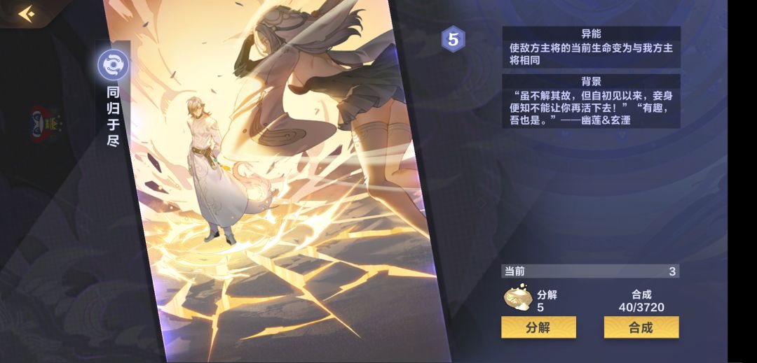【同归于尽】这张卡带几张我很纠结,一般用一张就可以结束战斗,用完不是翻盘就是翻车,带两张万一要抽不到要被斩了能急死,带三张容易卡手,万一手上三张同归于尽,换牌之后又一张没剩,只能大骂发牌员有病,不如右上当场自尽