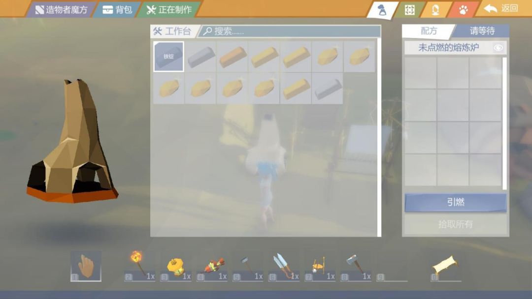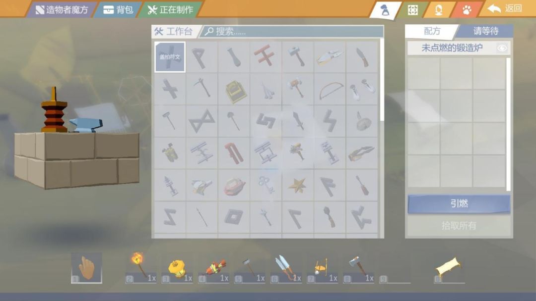 最后,5个铁锭+1个任意锤子制作成1个“铁砧”之后,加上之前制作完成的工具,终于可以合成“锻造炉”了!
