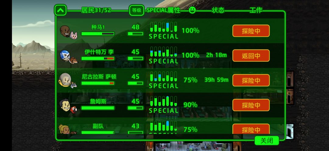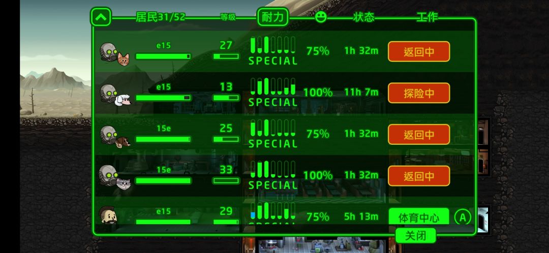 第一条自然是E,这关系到血量高低,因为我们没有三级装备工坊,所以只能用5e的废土装,不过已经足够了,训练满e属性就可以穿上废土装拉出去升满级,然后再考虑升其他属性。(我就比较尴尬,没注意55人口就能升2级装备工坊,所以现在只能得到任务里获得的5e废土装来升,以至于现在还没有一个满级