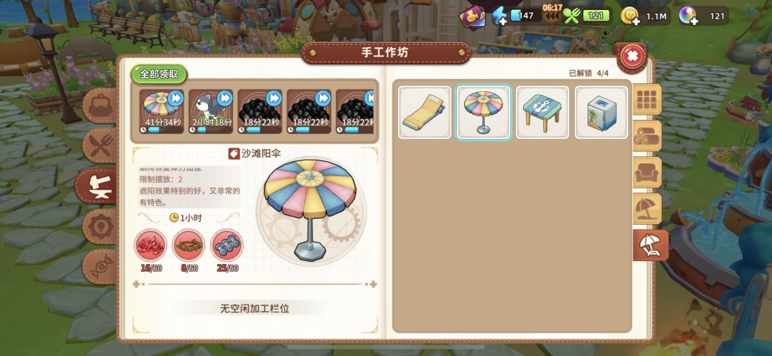 我满配天堂岛一不小心又做了一把遮阳伞,都说明是限制两个了为什么还能做?我的材料,我的金币。。。又不能卖,又不能放,又不能取消。。。我太惨了!