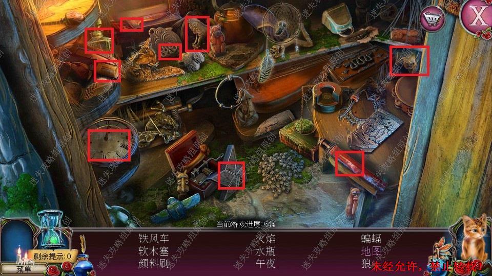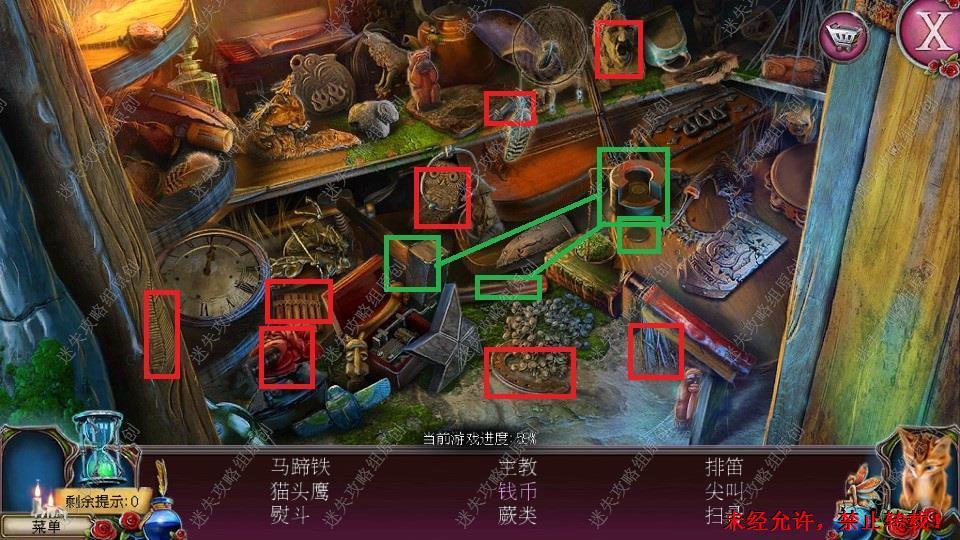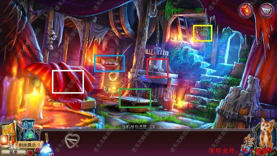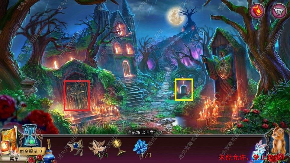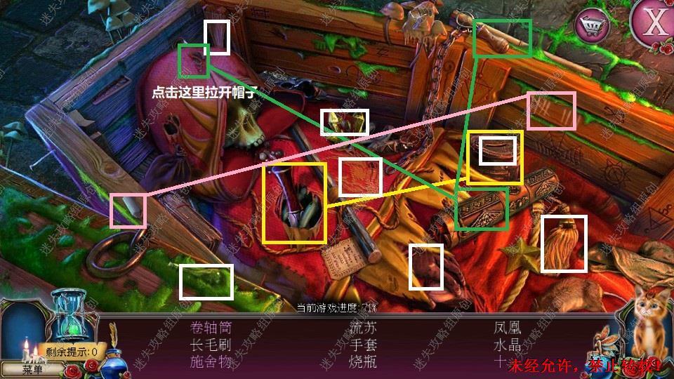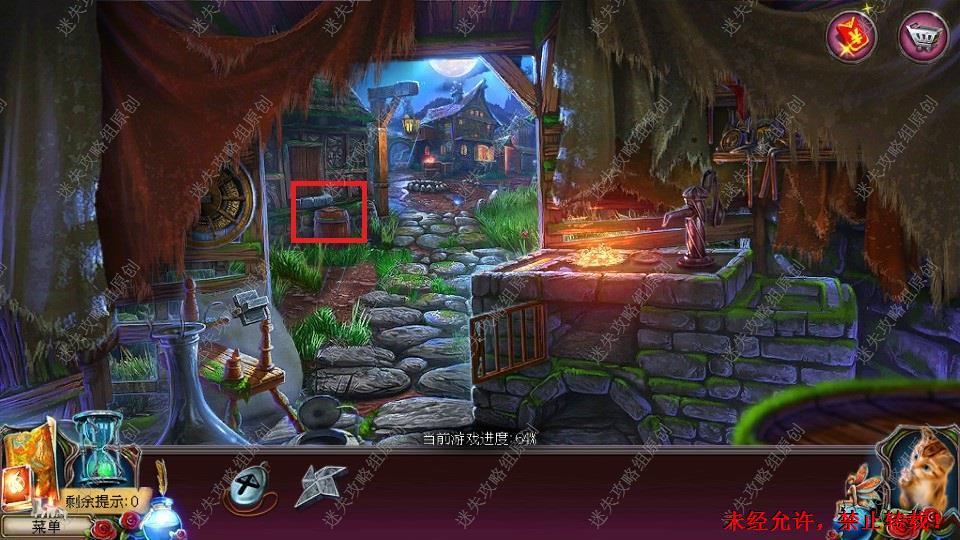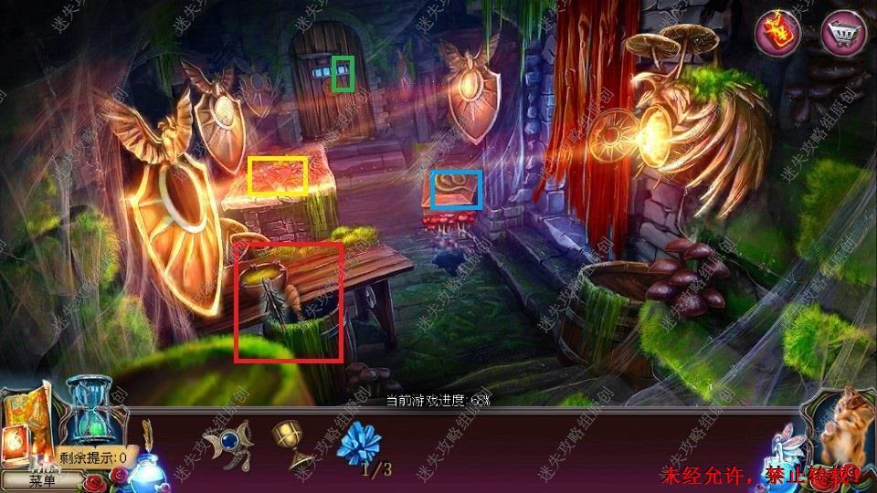 69、红圈处使用硬鹿勋章,进入。密道里对右侧绿光处点击,直到提示说要用什么东西装萤火虫,退出密道,前往黄圈处,完成小游戏。