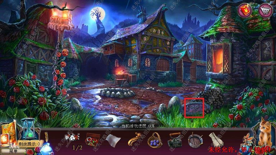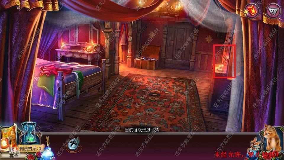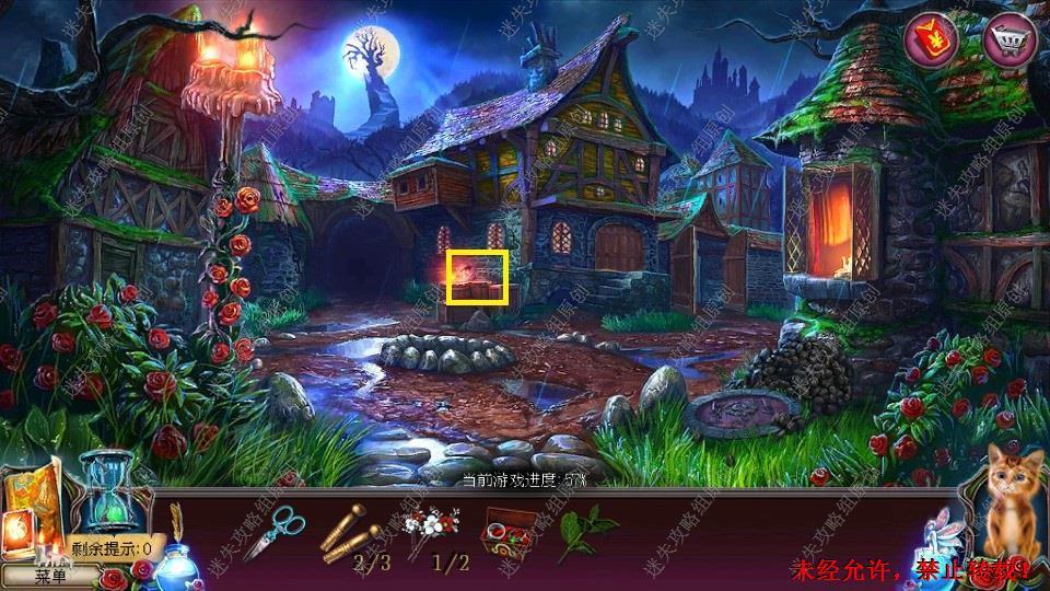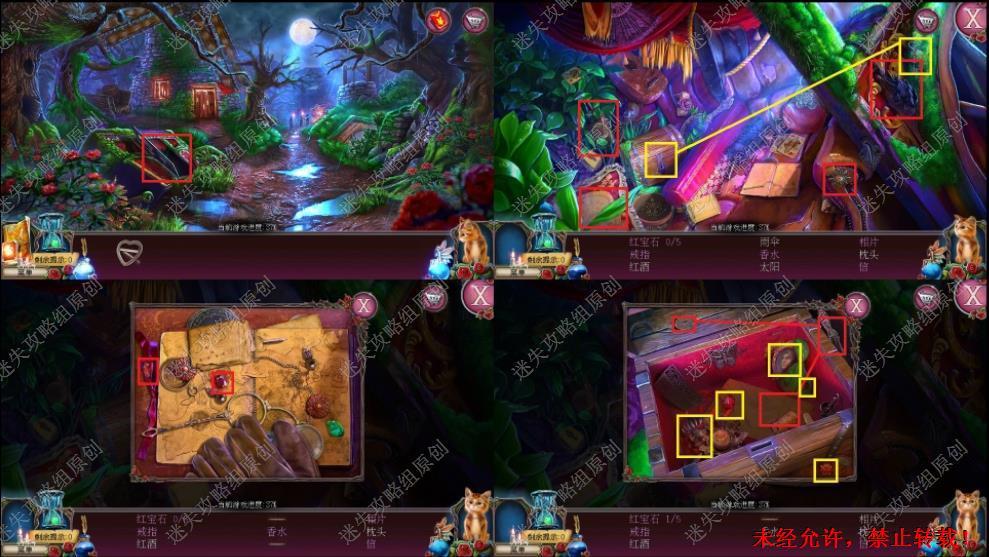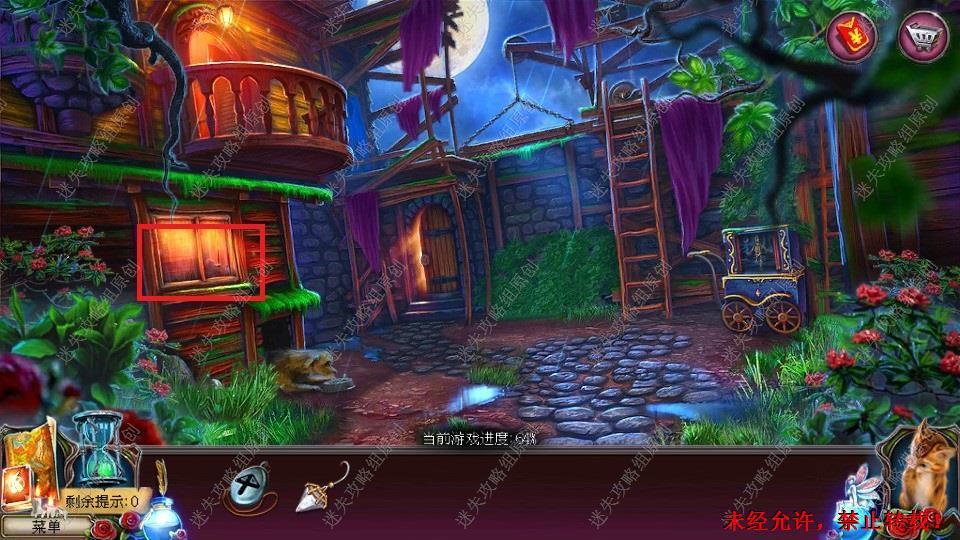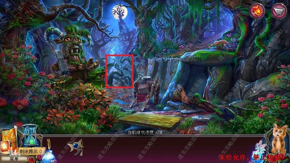 69、红圈处使用硬鹿勋章,进入。密道里对右侧绿光处点击,直到提示说要用什么东西装萤火虫,退出密道,前往黄圈处,完成小游戏。