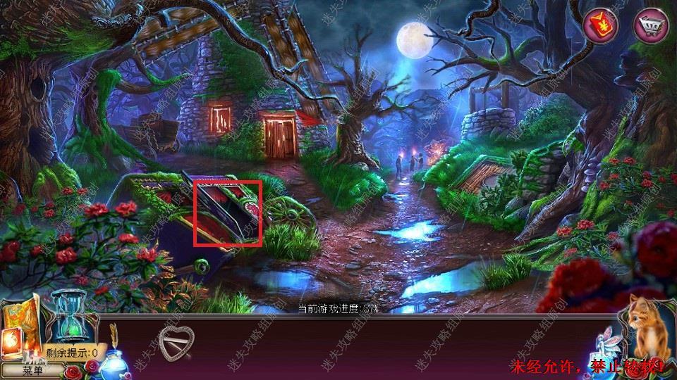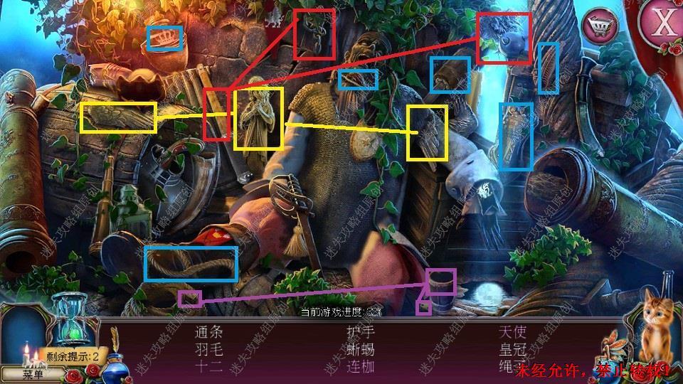 85、红圈处得到乌鸦印记,黄圈处得到银剪子,纸夹。绿圈点击放入乌鸦印记,小游戏。得到里面的发夹,同时用剪刀剪下月亮石得到。再前往篮圈进入。85