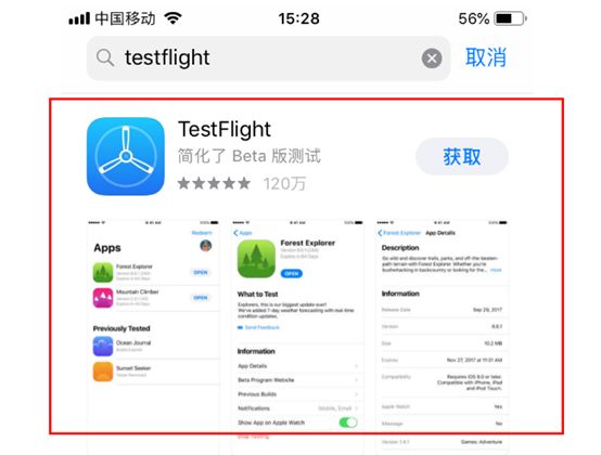 在苹果移动终端App Store搜索“TestFlight”,点击“获取”进行下载。