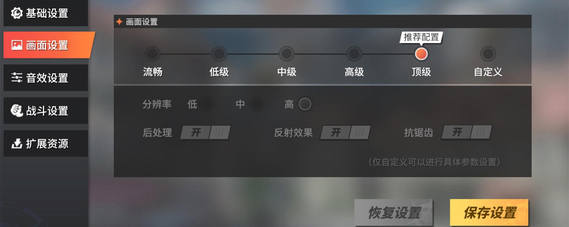 航海王热血航线中想要调整画质的话,可以在设置中的画面设置进行调整,根据设备的不同会有推荐配置,同时也能够手动在流畅、低级、中级、高级和顶级五种设置间切换。如果选择自定义设置的话,可以自行调整分辨率、后处理、反射效果和抗锯齿等选项。