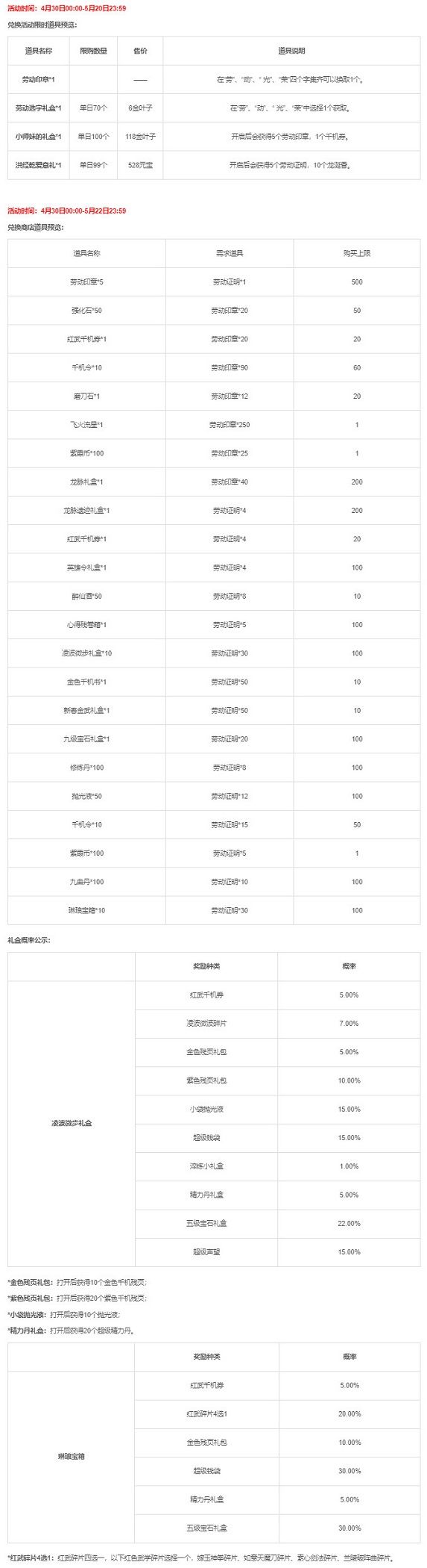 活动一:活动期间将限时上架劳动节礼包,礼包内容如下: