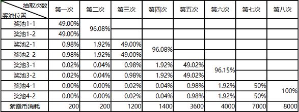 *【概率说明】:此表为默认每次抽到最高概率道具时的概率,如若第一次抽到奖池2-1道具,因抽奖获得道具将不再重复获得,则第二次实际抽奖概率与图中描述第二次概率不同,抽到高奖池道具概率会相应提高。