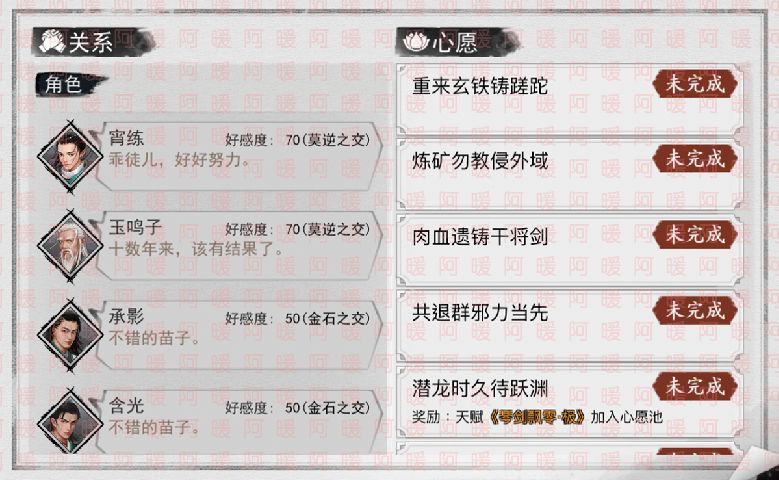 对话后再阴阳界铸剑室门口点莫邪子进入剧情,剧情中触发选择,这里不同的选择完成的任务也不同,所以莫邪子的情缘任务需要最少2周目,这里我选的【任由掌门殉剑(莫邪子隐退)】