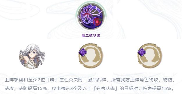 暗阵容铺路阵,没太多好说的,暗系都带debuff,较强力的阵法。预示着接下去池子会对暗系进行补完,暗不再是工具人。
