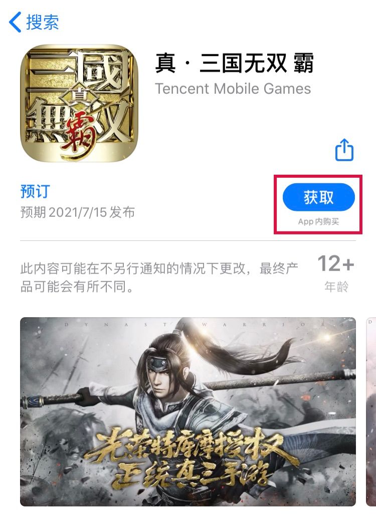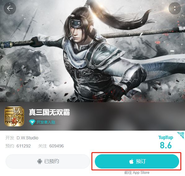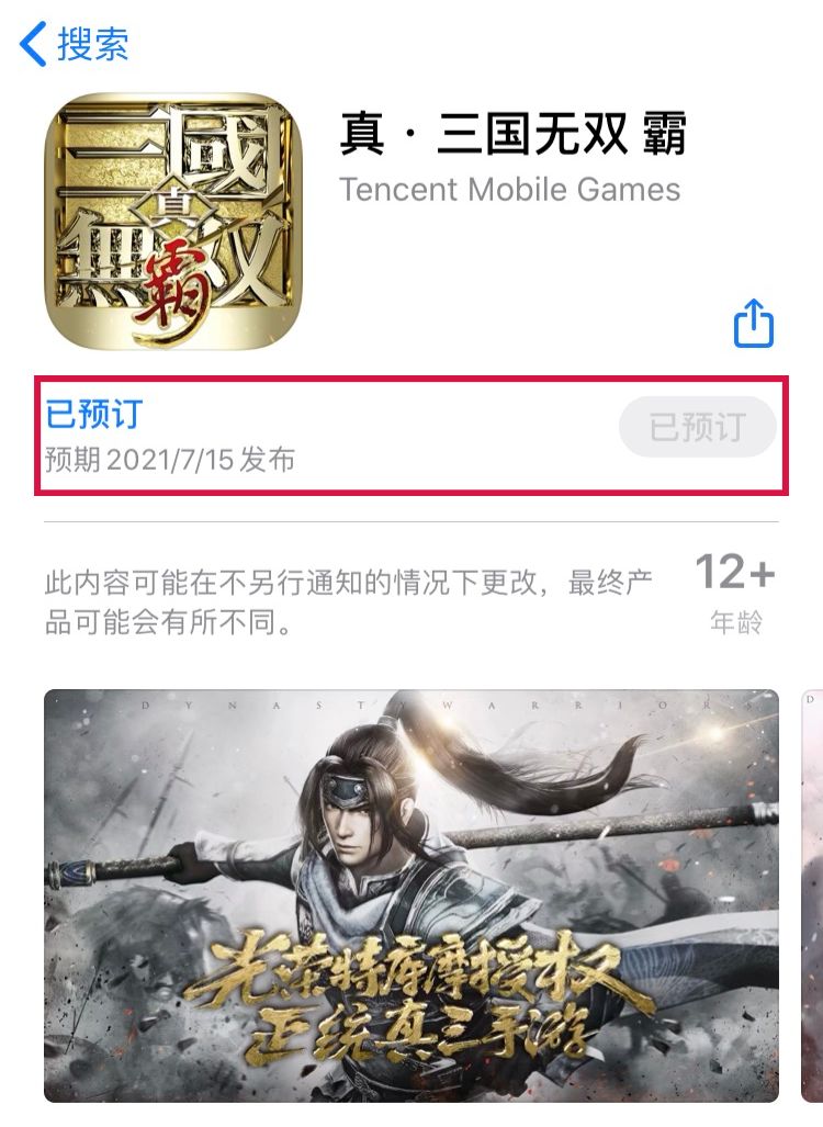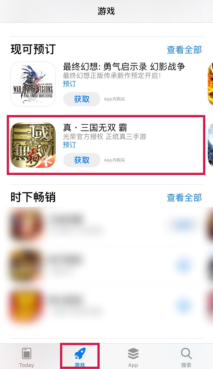 打开App Store选择下方游戏专区,下拉到【现可预订】版块,找到《真·三国无双 霸》;