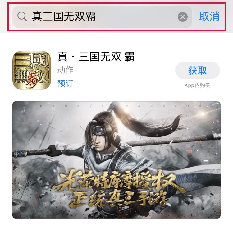 也可以直接搜索“真三国无双霸”关键词,从搜索结果里找到《真·三国无双 霸》手游,进入专属页面进行预订。