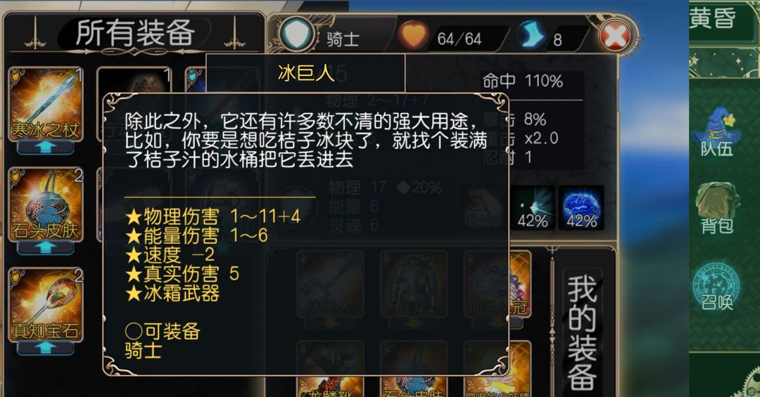 武器(冰霜武器效果是攻击目标进行减速判定)由于骑士靠反击打伤害,所以基本那个怪攻击骑士,哪个怪就被减速。
