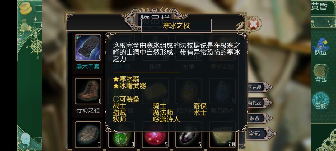 PS:寒冰箭没啥用,而且装备有了,并且有寒冰武器效果(攻击对目标减速判定,成功就减少目标速度),不过这件装备不推荐,减速由骑士提供,法师珍贵的蓝和行动都用来附魔和打魔弹乱射了,没有行动留给寒冰箭,装备下图所示