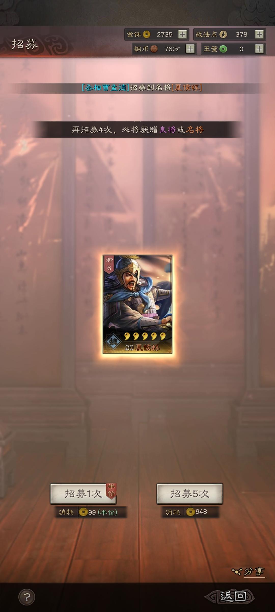出刘备的时候我惊呆了,因为这不是保底,而是半价,我也没有氪,我只抽半价和免费,还有我是零氪,不可能会是氪金的力量。接下来我说说是怎么样的技巧让我抽了这么多将。先给大家看看我这几天出的(群里兄弟都说我狗托😂)