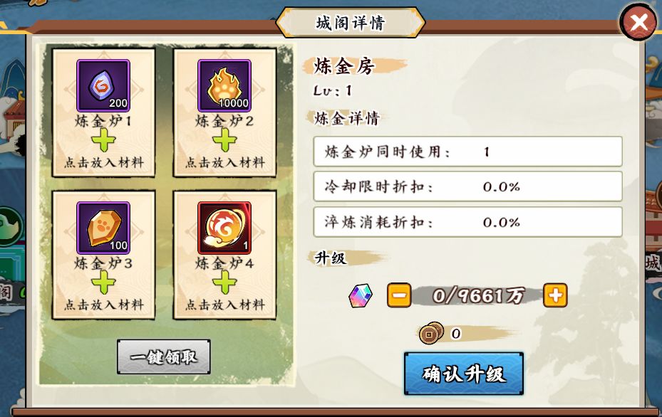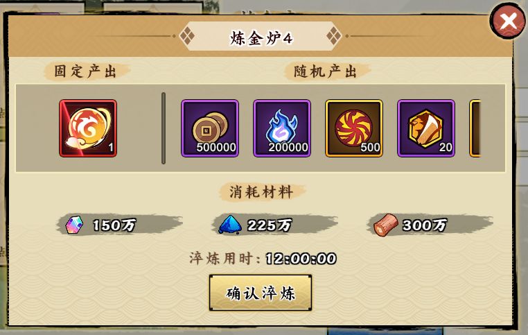 2. 炼金房共有4个炼金炉,分别需要消耗不同的材料与时间,产出不同的材料。