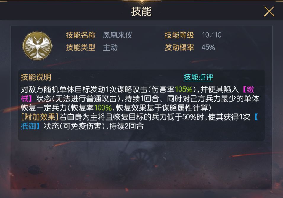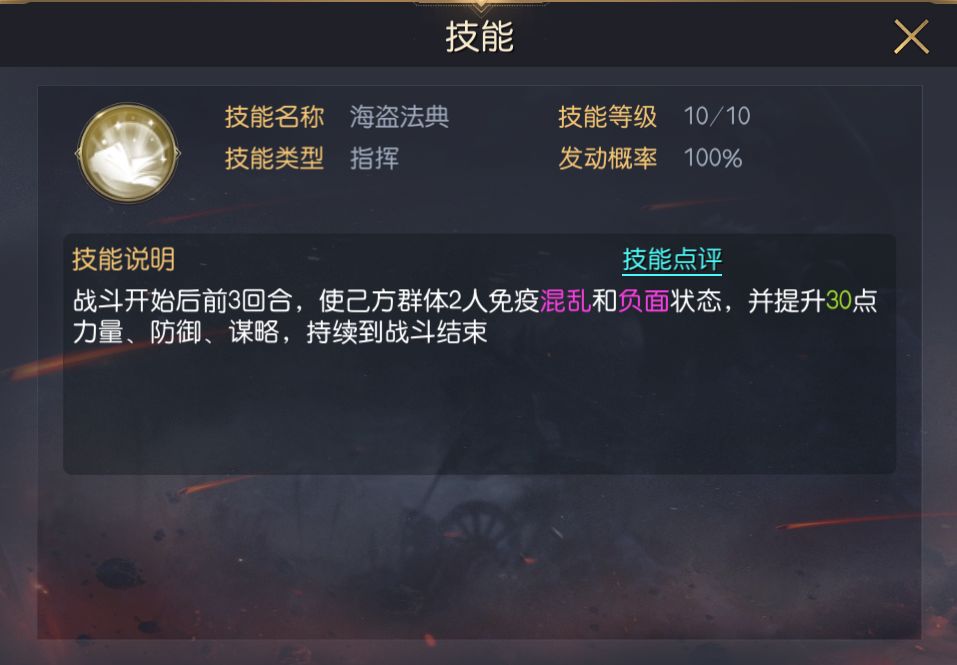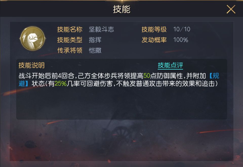 三技能推荐坚毅斗志,该技能可提升己方全体步兵的防御并施加规避,虽然该阵容具备一定的续航,但将领本身坦度较低,全员自带兵种都为步兵,利用坚毅斗志的加成效果能提升整体坦度。