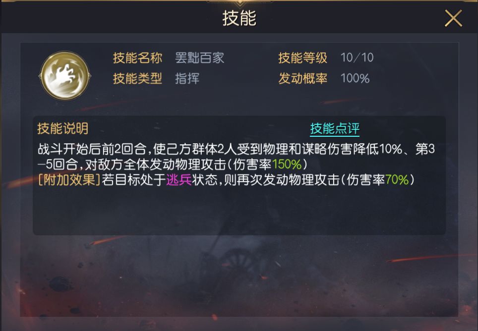 二技能推荐关键决策,该技能可在前3回合降低我方受到的伤害,并限制敌方谋略输出,从4回合开始提高己方全体物理伤害,与刘彻的爆发期一致。
