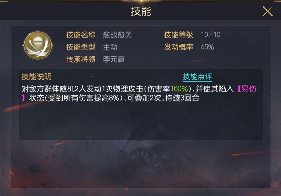 三技能推荐愈战愈勇,该技能可造成群体伤害并施加易伤,持续时间3回合,能有效提高队伍的实际伤害。