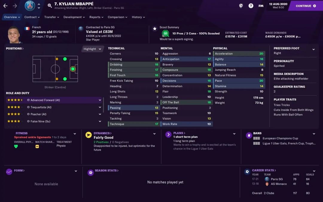 而球员转会也有捷径可走,安排球探的步骤完全可以跳过,你可以选巴黎和曼城这样的土豪球队,直接买现实中成名已久的超级巨星,也可以直接百度“FM2021 妖人”,轻松的找到游戏里最具性价比的高潜力年轻球员。
