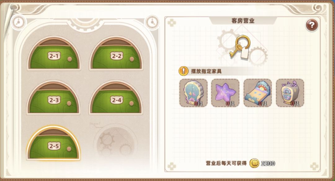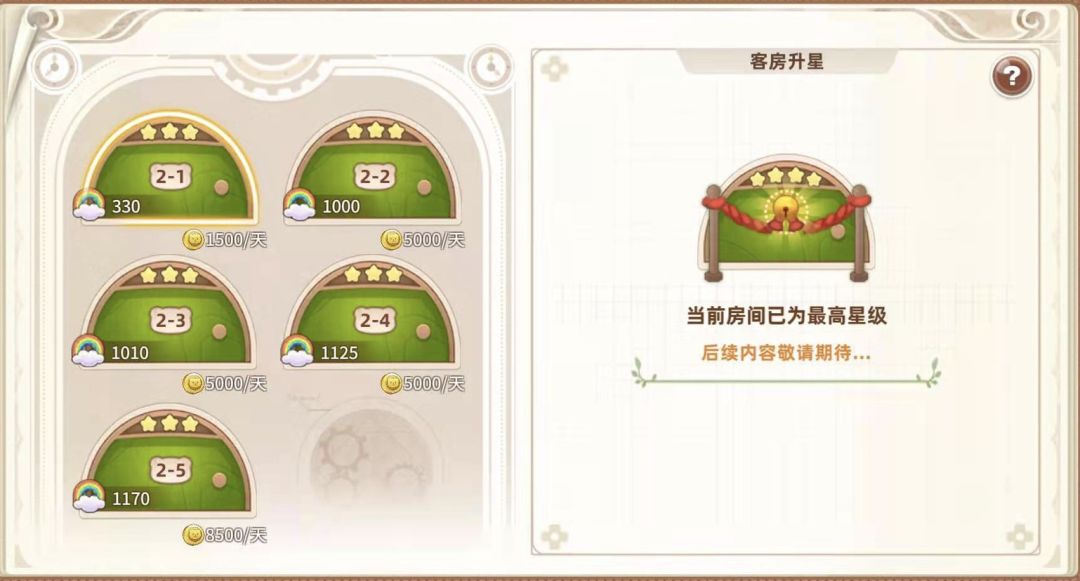 一共五间房间,最高等级为3级,分别是1500、5000、5000、5000、8500金币,每天12点收房,最高可以累积7天。