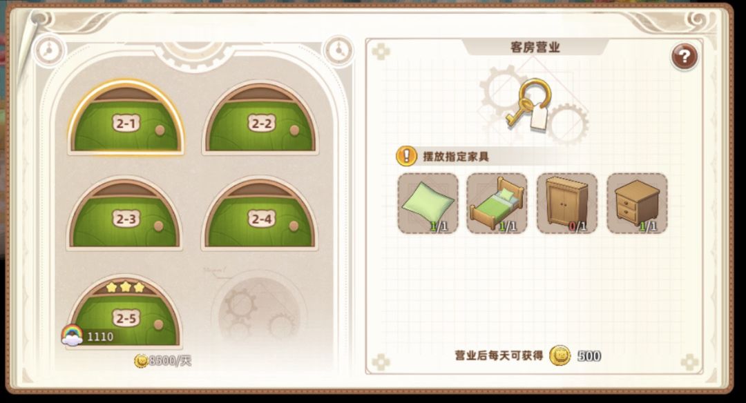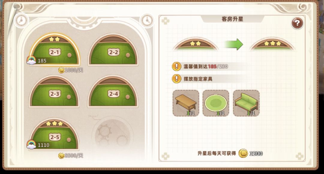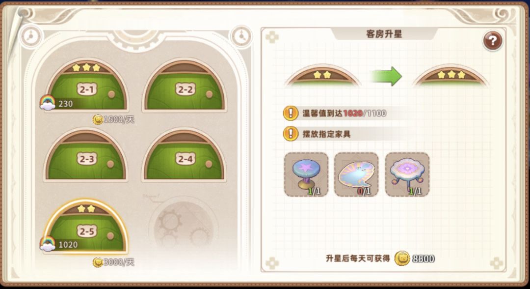3星需要三个家具、温馨值1100,收入8500
