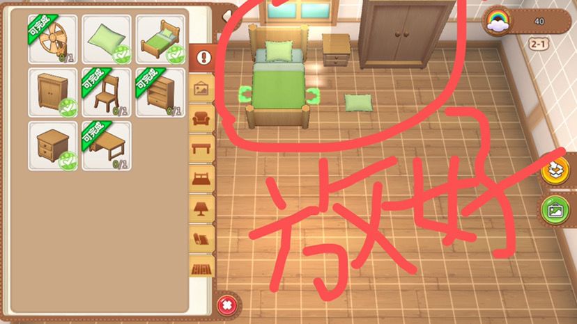 3、进入房间内,按照要求点装饰进行摆放,注意(升级不仅需要家具也需要温馨值达标)。