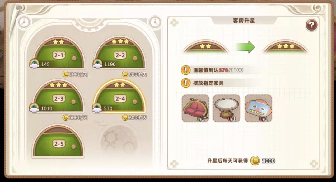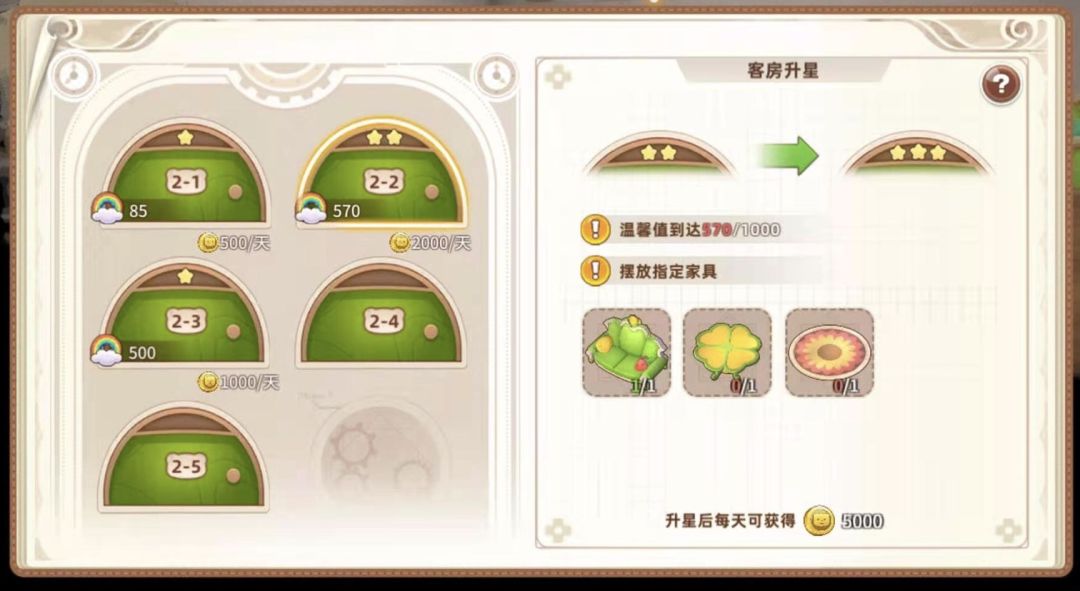 2星需要四个家具、温馨值570,收入2000