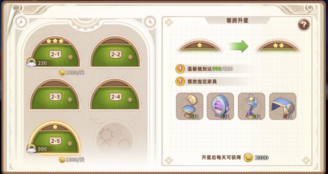 2星需要四个家具、温馨值860,收入3000